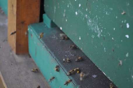Der Frühling ist angekommen, und unsere Bienen sind voller Tatendrang. Der Frühlingsputz ist erledigt, alte Waben wurden entfernt, und an den Fluglöchern herrscht schon emsiges Treiben. Die fleißigen Bienen tragen Pollen für ihre Nachzucht ein – ein wunderbares Bild der Natur in Bewegung.